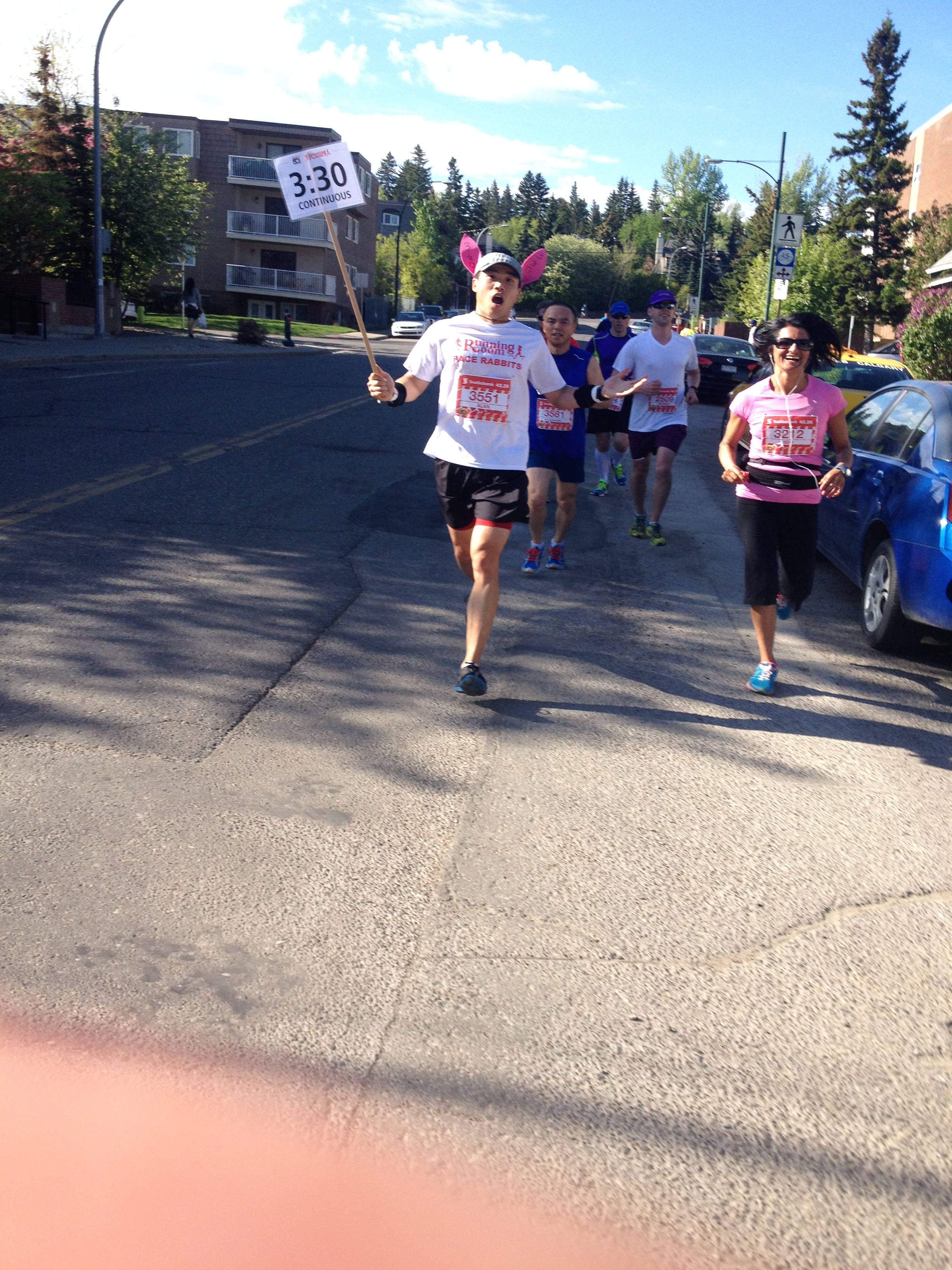 Out and backs are always one of my favourite parts of any race. Nearing the turnaround point, I find it very motivating to see the faces of those I’m competing with and against, but the best part is when you spot a friend! I was able to catch a glimpse of Steve before he tore back up 16th and soon after the turn it was time for high five #2 (with serious air this time) for Andrew (which I believe I initiated and he later regretted – sorry, Andrew!) Just before I turned right onto 16th I gave a big wave to the 3:30 pace leaders, Dave and Barry (and must have just missed 3:35, i.e. W18-34 BQ, pace leader, Alan.) A third of the way through, I felt good and was on track.